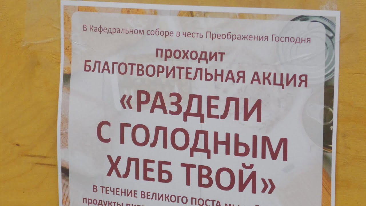 «Дорогие друзья. Православные храмы всегда были местом сосредоточения разного направления работы, и молитвенной, и образовательной, и благотворительной. Поэтому наш преображенский собор регулярно организует разного рода благотворительные акции и мероприятия. И сейчас в дни святого великого поста, когда надо особое внимание благотворительности жители города могут принять в этом участие, через Преображенский кафедральный собор.»