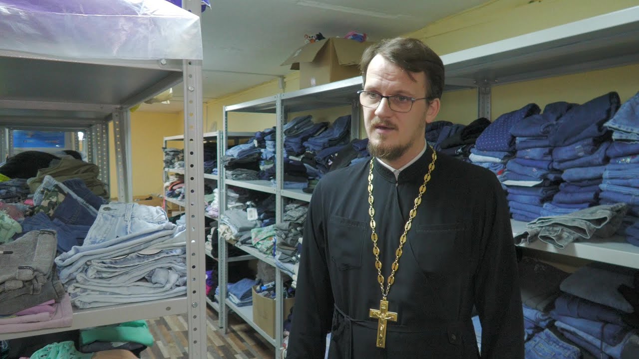 «Надо сказать, что церковь едина и вся церковная деятельность подчинена единому и главному –это служение Богу и людям. Сейчас ситуация в мире и нашей стране мы понимаем, что в связи с мобилизацией в помощи нуждаются не только наши солдаты военнослужащие, которые идут защищать нашу Родину, но и оказавшиеся здесь члены их семей тоже могут оказаться в сложной жизненной ситуации. Церковь всегда была со своим народом и мимо нужды мы никогда не пройдем. Здесь можно получить и принести помощь. Здесь работает пункт распределения нашему населению.»