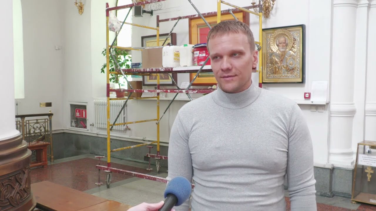 Художник поясняет, что сюжет росписи по церковным канонам. Работает иконописец достаточно быстро, но несмотря на профессионализм, роспись храма — дело не быстрое, порой исчисляется годами. Кропотливая работа затронет не только нижнюю часть собора, но и под купольной частью.