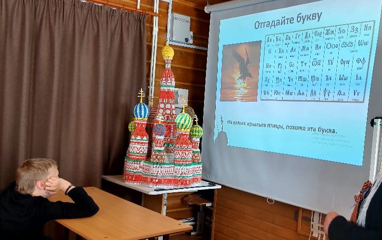 Вторая часть занимательного урока предполагала работу с алфавитом Кириллица. Конкурс «Отгадайте букву» вызвал множество эмоций. Подключив образное мышление и воображение, нужно было соотнести предложенный образ-картинку с внешним видом буквы.