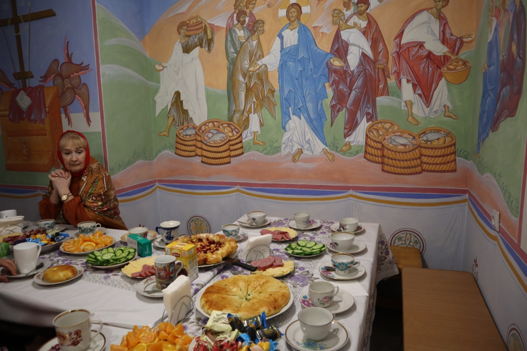 А в самый день Светлой Пасхи члены общины собрались на праздничное чаепитие вместе с настоятелем иереем Евгением Калашниковым. Не смотря на стесненные условия, т.к. храм во имя святого апостола и евангелиста Иоанна Богослова совершенно не большой, а трапезная и того меньше, место за праздничным столом нашлось для всех.