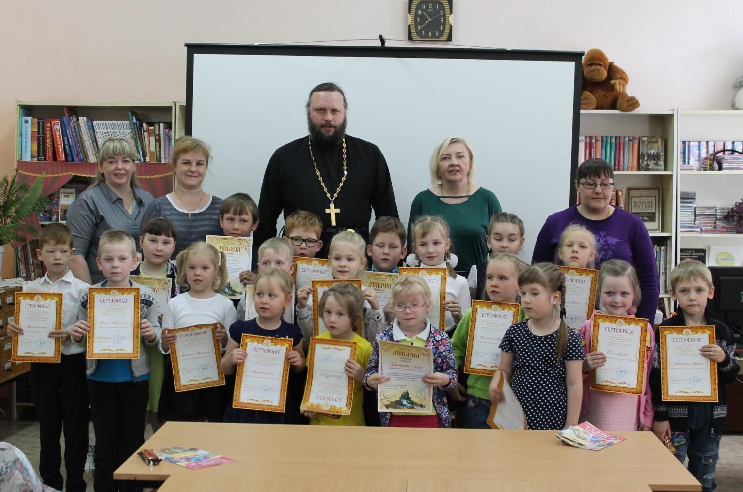 Победители и участники конкурса были приглашены для награждения в Центральную районную библиотеку. Для ребят и их наставников была подготовлена познавательно-игровая программа, из которой участники узнали о формах проявления доброты, вспомнили пословицы и поговорки и даже сами создали картину добра. Отец Николай рассказал ребятам о самой главной Книге, несущей добро на Земле – Библии. Также было организовано чаепитие, где ребята могли пообщаться с батюшкой и задать интересующие вопросы.