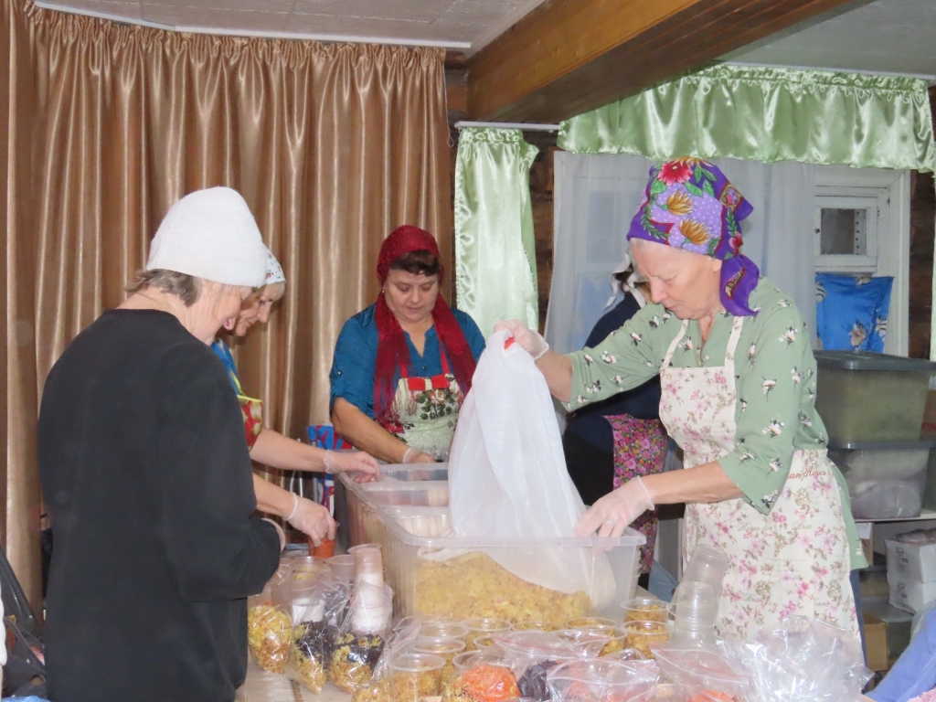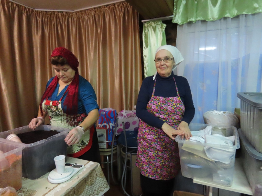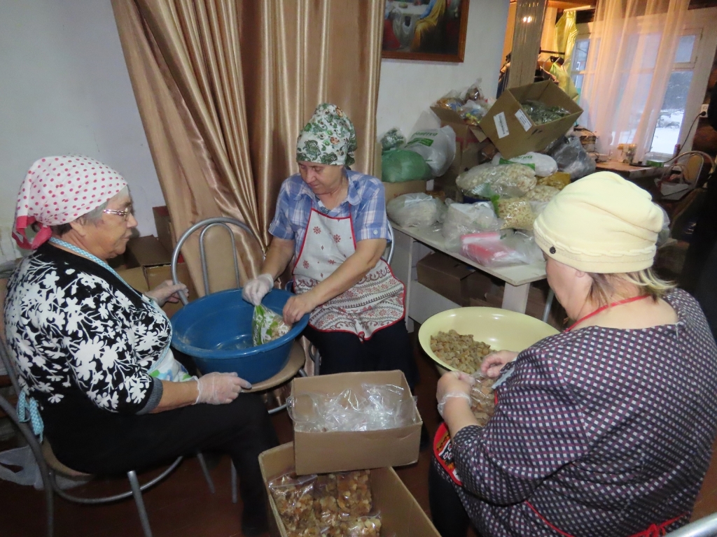 В трапезной храма женщины собирают партию для бойцов Лисичанского направления: сухие овощи, специи, сухарики и уральский майонез – всё в пакетах, чтобы пятеро могли сварить сытный суп в полевых условиях. За сессию фасуют до 1500 порций, а в месяц – две отправки. Всё на пожертвования и безвозмездный труд.