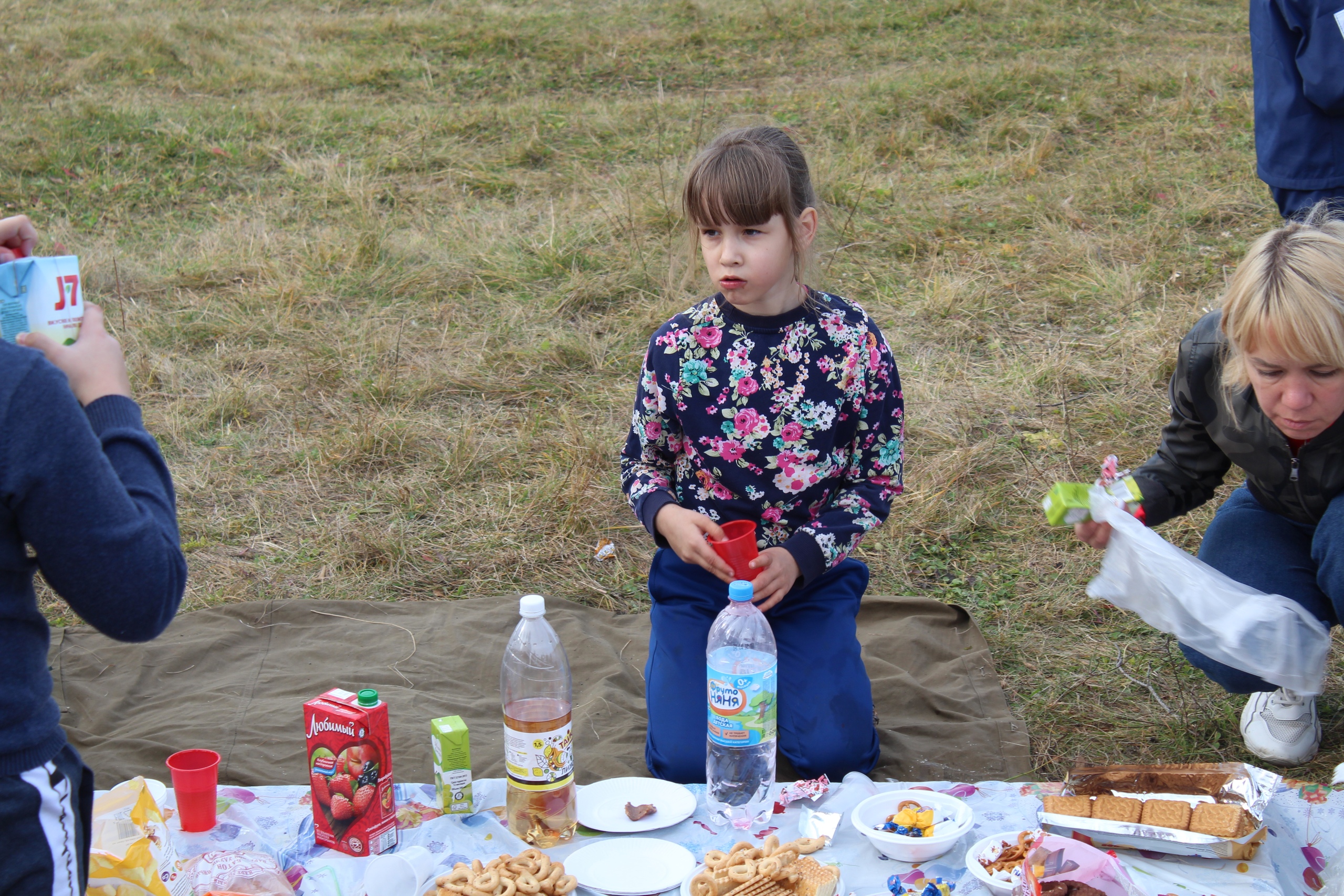 Тем временем, женщины и девочки накрыли большой «стол» для общей трапезы, а мужчины разожгли костер и мангал. Каждый мог пожарить себе сам сосиски и хлеб или скушать уже любезно приготовленные с пылу-жару.