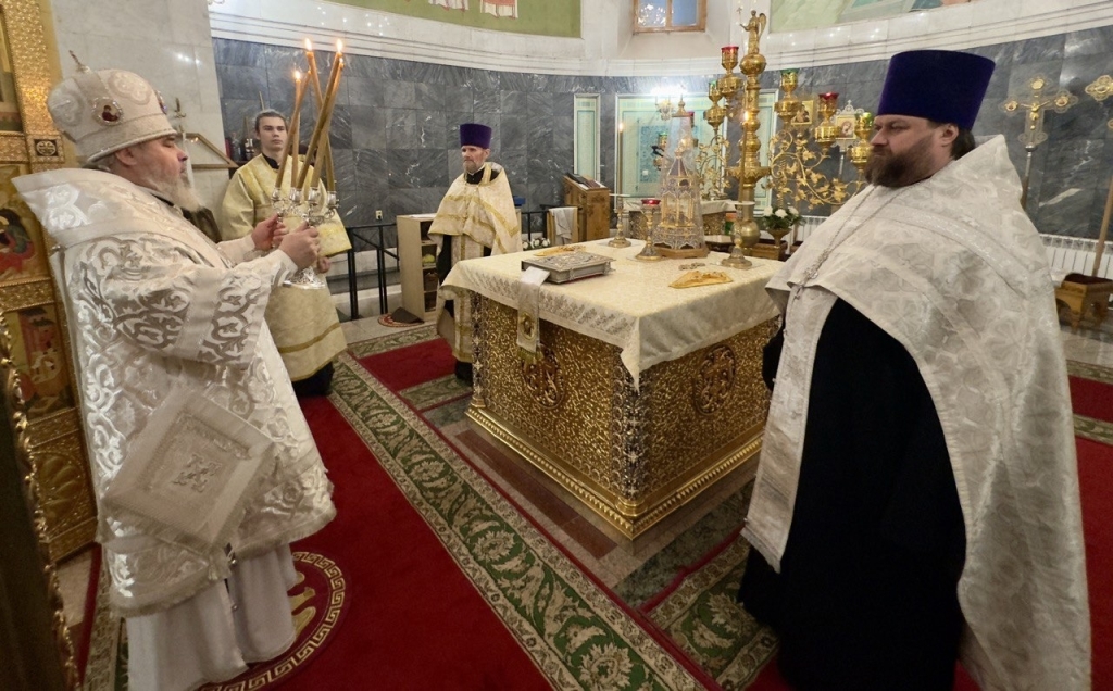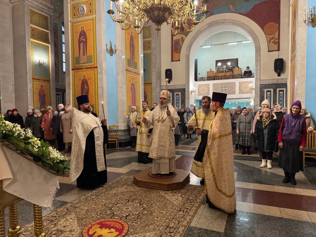 Его Преосвященству сослужили настоятель собора протоиерей Андрей Лимонов и клирики храма.