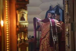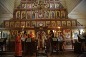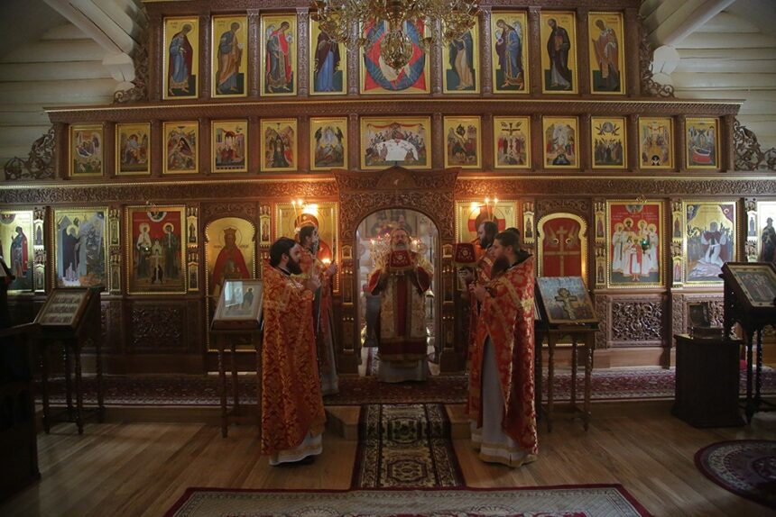 За Божественной литургией Его Высокопреосвященству сослужили: секретарь епархиального управления Екатеринбургской епархии иеромонах Кирилл (Корытко), исполняющий обязанности наместника Царской обители иеромонах Мелитон (Зыбин), братия обители в священном сане и клирики Екатеринбургской епархии.
