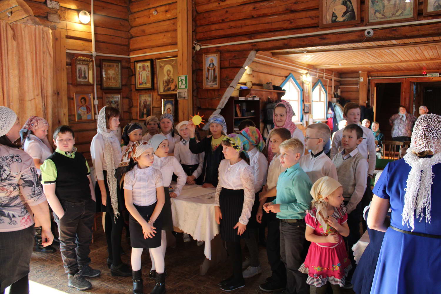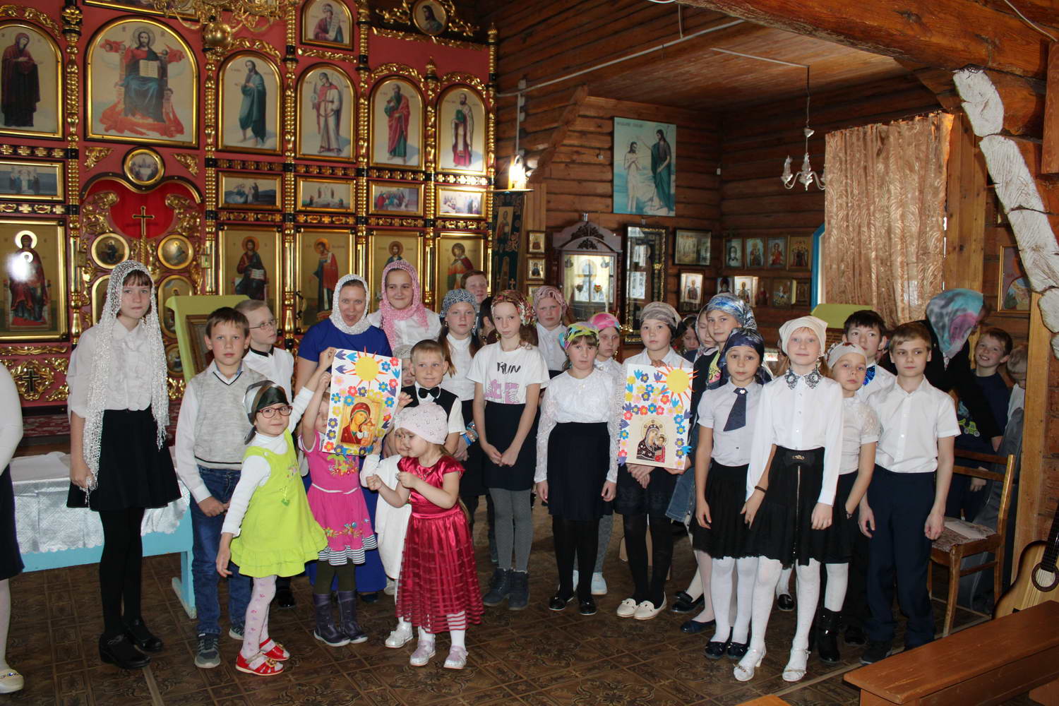 В честь праздника ребята читали стихи, пели песни, участвовали в конкурсах. Объединившись в две команды, старшие и младшие, показали свою сплочённость при изготовлении солнышка и цветов (при этом многие взрослые воспитанники помогали малышам выполнять трудные, но интересные задания). В самом конце ребята украсили Казанскую икону Божией Матери цветами. Праздник получился интересным и познавательным.